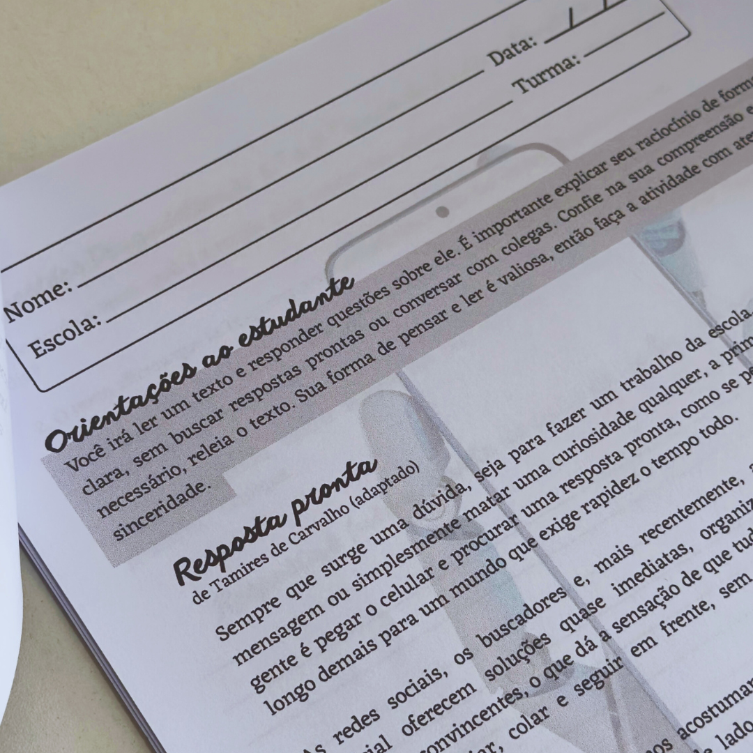 A partir de um texto atual, que dialoga com tecnologia, inteligência artificial e pensamento crítico, o material propõe questões discursivas cuidadosamente organizadas para os Anos Finais do Ensino Fundamental, Ensino Médio e EJA, permitindo uma análise real da compreensão leitora.